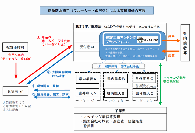 ユニオンテックが展開する施工業者マッチングサイト「SUSTINA(サスティナ)」を活用して、自己負担で工事を希望する住民からの申し込み・問い合わせにあたり、工事業者などの登録・案内を行う。同事業に参加する施工事業者の旅費・滞在費などを負担する。応急防水施工費やブルーシートなどの資機材費は住民負担。