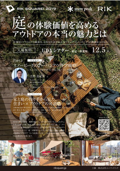 ユニマットリック(東京都港区)は、エクステリアの「今」と「これから」を考える交流イベント「RIK SQUARE!2019(リックスクエア2019)」を、東京・UDXシアターにて12月5日に開催する。仙台・名古屋・大阪・広島・福岡の各会場でインターネットライブ中継も実施。
