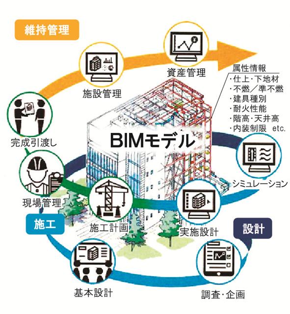 BIM(Building information Modelling)とは3次元の形状データとともにコストや仕上げ、管理情報などの建物の属性データを持つ建物情報モデルを構築するシステムで、コミュニケーションツールや建物の生産プロセス・維持管理における情報データベース、IoTやAIとの連携などが期待されている。
