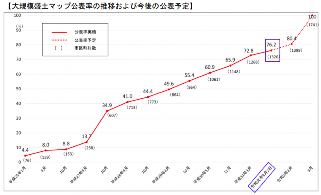 2019年9月末時点での大規模盛土造成地マップの公表率は76.2%(1326市区町村)で、同年3月から+3.4%増加。公表予定時期については、2019年度末までに全国1741市区町村のすべてで公表予定であることが分かった。また、2019年9月末時点で大規模盛土造成地があると判明している地方公共団体は637市区町村、大規模盛土造成地なしは689市区町村だった。