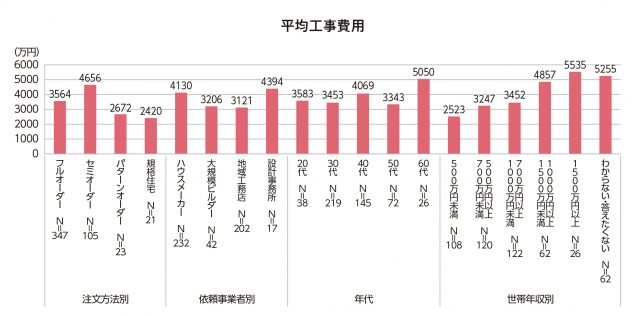 注文方法別に平均工事費用を比較すると、セミオーダーが4千万円台後半で最も高く、制約の厳しいハウスメーカーや大規模ビルダーで窮屈さを感じながら家づくりを行っている施主の姿が見て取れる。