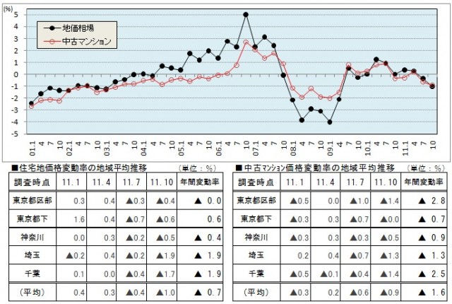 また、2010年10月~2011年9月までの年間ベースでみると、住宅地・中古マンションともに平均でマイナスに。住宅地地価変動率は、首都圏エリア平均で▲0.7%(前回+0.3%)と、7四半期ぶりにマイナスに転じた。中古マンション価格も平均で▲1.6%(前回▲1.0%)とマイナス幅が拡大している。