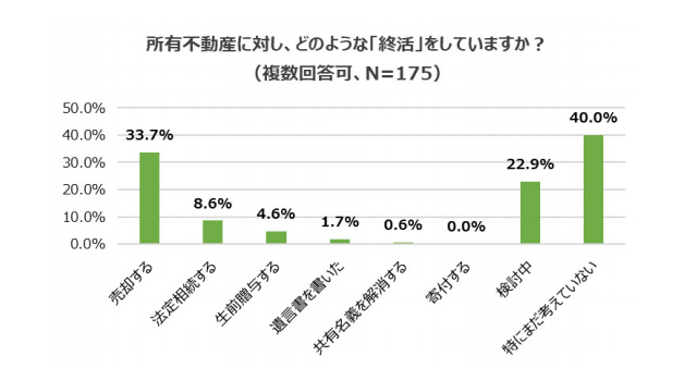 不動産関連の比較査定サイト「リビンマッチ」を運営するリビン・テクノロジーズ(東京都中央区)は、11月15日の「予防争族(相続)を考える日」(税理士法人アプト会計事務所小諸事務所制定)に合わせて、50歳以上の不動産を所有する人を対象に「不動産の終活」について調査し、その結果を発表した。所有不動産に対する終活について、6割以上が「まだ考えていない」(40.0%)や「検討中」(22.9%)と答える中、33.7%が「売却する」と回答。アンケート回答者の1/3が、所有不動産は他界する前に処分したいと考えていることがわかった。「法定相続する」(8.6%)、「生前贈与する」(4.6%)、「遺言書を書いた」(1.7%)、「共有名義を解消する」(0.6%)という回答もあった。