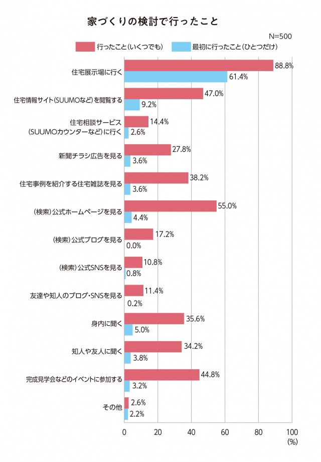 住宅選びをする際に最初に行ったことで最も多かったのは、住宅展示場に行くこと。6割の人が最初に住宅展示場に行ったと回答した。2番目の住宅情報サイトの閲覧は1割弱で、大きな差がある。実際に建物をみたいという要望が強いことと、どこから手を付けたらいいのか分からず、手っ取り早くリアルに情報を集めようとする生活者の様子が浮かび上がる。
