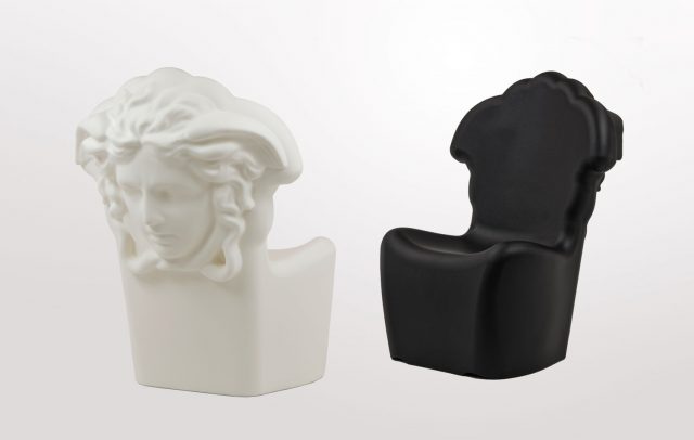 今回の家具は、日本初上陸。ゴールド・バロック柄のファブリックをつかったソファや、メデューサをモチーフにしたチェアなど、大人の遊び心にあふれたデザインとした。