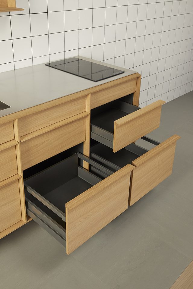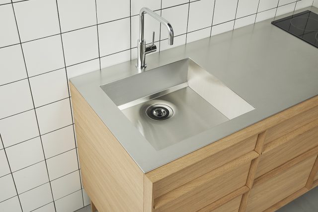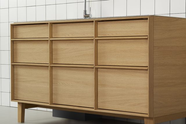 国産ナラ材とステンレス天板を組み合わせたコンパクトキッチンで、キャビネットのデザインは、3次元的な奥行きのある縦横ラインがリビングのサイドボードを思わせる。 W1200/1500xD637xH850mm。税込34万5000円〜。