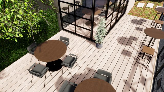 デッキには、ホワイトオーク色をラインアップ。切りっぱなしでも自然な風合いが得られ、光の当たり具合によって北欧風やアンティーク調になるという。