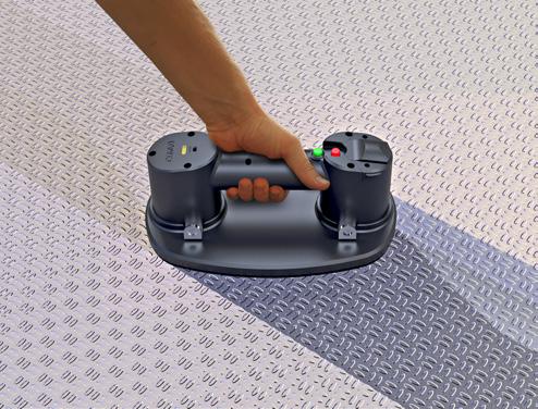 グラボは、親指のスイッチ操作で瞬時に接着面の空気を抜いて固定したり、解除したりできるので作業効率が大きく高まる。現場や工場で必要なものを持ち上げて移動したり、設置したりするのに役立つ。