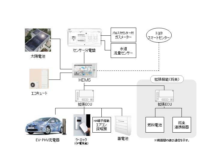 HEMSと家庭用蓄電池は、デンソー、ミサワホーム、新神戸電機との共同開発。系統電力と連系した蓄電池を備えることで系統電力の負荷が高い時間帯に買電を抑制することなどができるほか、通信により外出先から施錠忘れの確認・施錠やエアコンのオン・オフ、帰宅前の風呂の湯張りなど、便利で安心な機能も持つ。