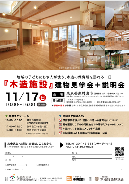 相羽建設(東京都東村山市)は、「木造保育園のお披露目会」を東京都東村山市にて11月17日に開催する。