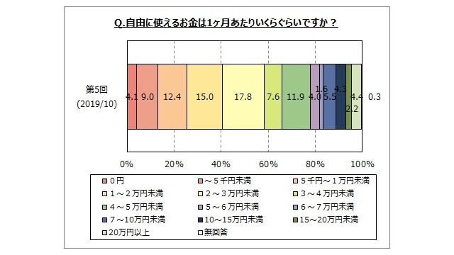 自由に使える理想の金額(月額)を尋ねたところ、「4~5万円未満」(19.2%)と回答した人が最も多かった。金額は男性のほうが高い傾向にあることがわかった。