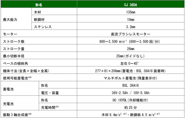 「コードレスジグソーCJ 36DA」は、独自の36V高出力蓄電池・マルチボルトとブラシレスモーターを搭載し、クラストップの切断スピードを実現。AC100V(コード付き)の従来機種(CJ160V)と比べ、切断スピードを約60%向上した。
