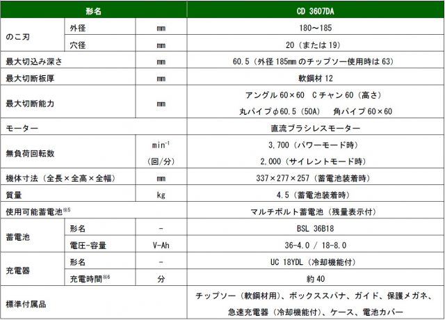 のこ刃径180〜185mmで、マルチボルトとブラシレスモーターを搭載することにより、AC品以上の最大出力と切断スピードを実現した。従来のコードレス機では切断できなかった鉄管50A(60.5mm)の一発切断が可能。