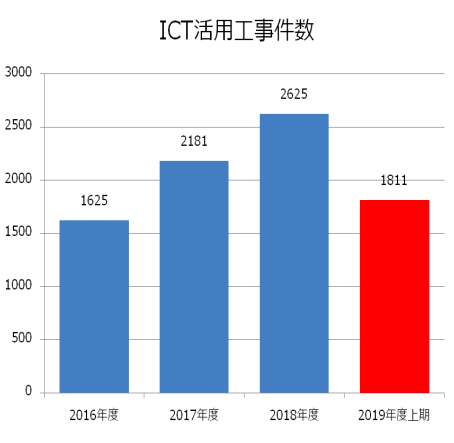 建設業界に特化したマーケティングを手がけるベーシックインフォメーションセンター(BiC、東京都千代田区)は11月8日、土木関連事業者向け営業支援データベース『全国土木工事情報 D-NET』をもとに、2019年度上期(4月~9月)におけるICT活用工事状況を調査し、i-Constructionの動向を明らかにした『2019年度上期ICT活用工事最新動向』を発表した。