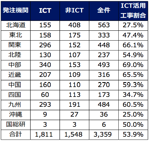 発注機関別に見ると、発注工事全件数では北海道開発局、中部地方整備局、九州地方整備局が多かった。一方、ICT活用工事の比率では、中部地方整備局、関東地方整備局、九州地方整備局が高くなっており、整備局間で差が生じ始めていることが分かった。