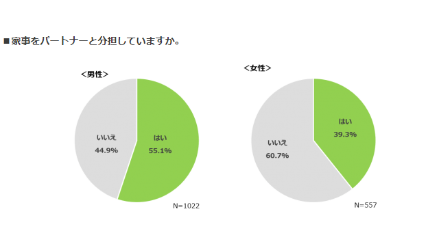 リクルート住まいカンパニー(東京都港区)が運営する不動産・住宅情報サイト「SUUMO(スーモ)」は、11月22日の「いい夫婦の日」に合わせて「自宅購入や家事について」の調査を実施し、その結果を発表した。パートナーとの家事分担について、男性(夫)は「分担している」と回答した割合が55.1%だったのに対し、女性(妻)は39.3%だったことから、男女間で家事分担への認識に差があることがわかった。