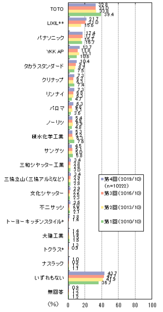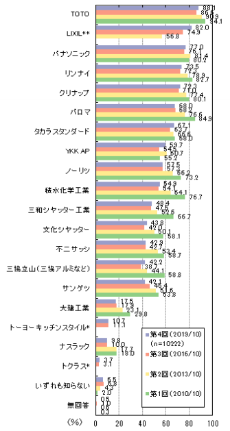 マイボイスコム(東京都千代田区)はこのほど、「住宅設備メーカーのブランドイメージに関するアンケート調査(第4回)」の結果を発表した。住宅設備メーカー認知率の上位5位は、「TOTO」(88.1%)、「LIXIL」(82.0%)、「パナソニック」(77.0%)、「リンナイ」(73.5%)、「クリナップ」(72.3%)だった。2013年調査との比較では、「LIXIL」の認知率が大きく高まる一方、他の4社はわずかに低下していた。