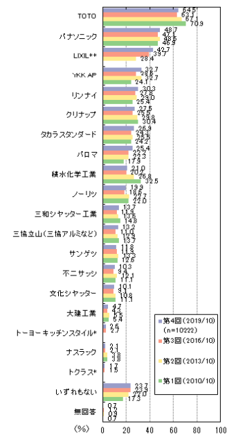 『信頼性・安⼼感がある』『品質・技術が優れている』『親近感がある』と思う住宅設備メーカーでは、「TOTO」が各5〜6割で1位だった。2位以下はいずれも「パナソニック」「LIXIL」「YKK AP」「リンナイ」の順だった。これらも2013年と比べて「LIXIL」の⽐率増加が目立った。