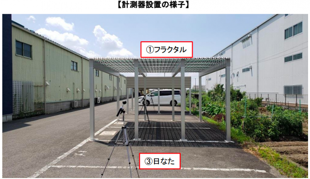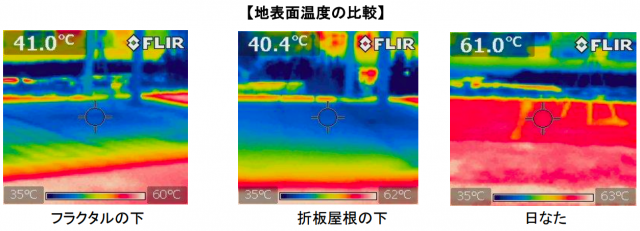 今年8月9日に行った日なたと「フラクタル日よけ」下でのWBGT計測では、日なたが平均32.4度に対して、「フラクタル日よけ」下では平均29.3度と約3度の差が出た。また、12時時点の地表面温度は、日なたが61.0度だったのに対し、「フラクタル日よけ」下は41度と20度低下していた。遮熱性のある折板屋根で完全に日影になるカーポートとの比較も行い、ほぼ同等の数値となった。