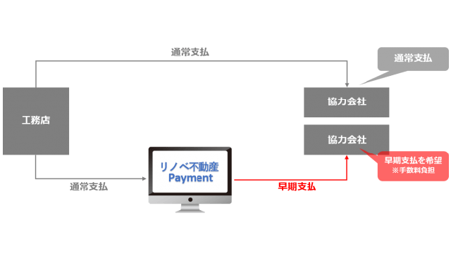 「リノベ不動産Payment」は、協力会社が代金を受け取るタイミングを「通常」または「早期」から選択できる支払いサイト。早期支払いサービスの利用料は協力会社の負担となるが、借入れではないため返済の必要もなく、協力会社への与信審査も不要。インベストデザインが運営する早期支払いサービス「ラグレスLag Less」のOEM提供により、リノベ不動産加盟店は「リノベ不動産Payment」を無料で導入できる。