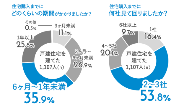 「住宅購入までに何社見て回りましたか?」との質問に対しては「2~3社」(53.8%)と回答した人が最も多く、「4~5社」(20.1%)、「1社」(16.4%)、「6社以上」(9.7%)と続いた。