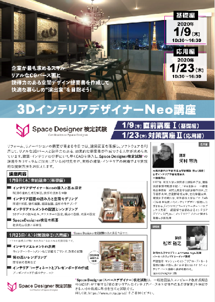 3Dパース作成ソフト「3DインテリアデザイナーNeo」を使用したSpace Designer検定試験のための講座で、建築図面およびインテリアコーディネーターと同等のインテリアに関する知識を有する人が対象。ソフトの知識・基本操作と検定の概要を学ぶ「直前講座Ⅰ(基礎編)」と、表現力やプレゼンボード作成テクニックなどを学ぶ「対策講座Ⅱ(応用編)」をそれぞれ実施するもので、1日のみの受講も可能。