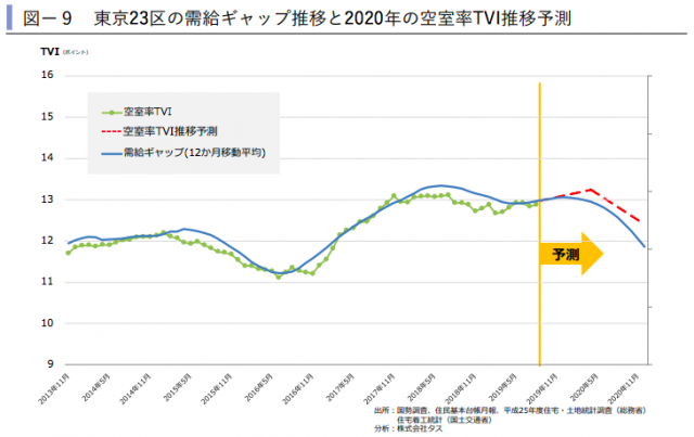 「2020年首都圏賃貸住宅市場の見通し」によると、世帯数の増加数が過去1年と同程度、着工数が過去1年の80%程度と仮定した場合、2020年の東京23区の需給ギャップは縮小傾向となり、空室率TVIも改善基調で推移する見通し。