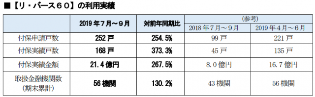 住宅金融支援機構(東京都文京区)は11月29日、住宅融資保険を活用したリバースモーゲージ型住宅ローン(「リ・バース60」)の2019年7月~9月期の利用実績を公表した。付保申請戸数は252戸で前年同期比254.5%、付保実績戸数は168戸で同373.3%となった。取扱金融機関数(期末累計)は、前年同期の43機関から56機関に増加した。