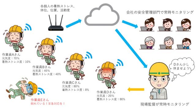 これまでの実証試験によると、外気温と暑熱環境下における各人の身体ストレスは必ずしも相関せず、熱中症リスクは個人差が大きいことが確認されている。つまり、外気温のみを基準とした対策では熱中症を防ぎきれないのだという。