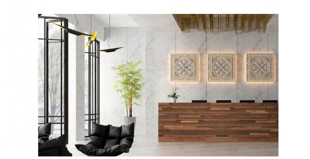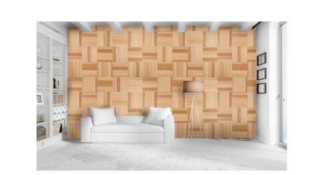 寄木細工調の「シダースクエア」は、突き板を60cm角の合板に貼り合わせ、ブロック状にしたパネリング材。10x600x600mm。4万8000円/ケース(10枚入り)。