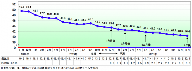今後の見通しについては、下振れ材料が多く、不透明感が一層強まることや、消費税率の引き上げなどを受けて落ち込んだ消費の行方に左右されることを指摘。貿易摩擦の激化などを背景とした輸出低迷と先行き不透明感による設備投資意欲の減退が予想されるほか、人手不足や原材料高などが招くコスト負担も引き続きの悪材料とした。
