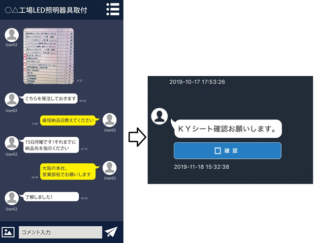 同社独自アンケート調査の結果、一番使われているというLINEの機能を持たせたチャットツール。確認ボタンを付加し、認識不足の解消を図った