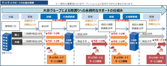 大京グループで工事事業を手掛ける大京穴吹建設(香川県高松市)は、居室内への雨漏りを永続的に保証する「ずっとずっとサポート」のサービス内容を拡充した。大京グループの全管理物件(大京アステージ、穴吹コミュニティが管理する全てのマンション)で利用できる。また、適用条件を満たした物件は、建物工事の保証期間(5年・10年)と大規模修繕工事の周期(約12年)のズレによって生じる「保証がおよばない期間」に発生する雨漏りについて、サポートサービスを受けることができる。