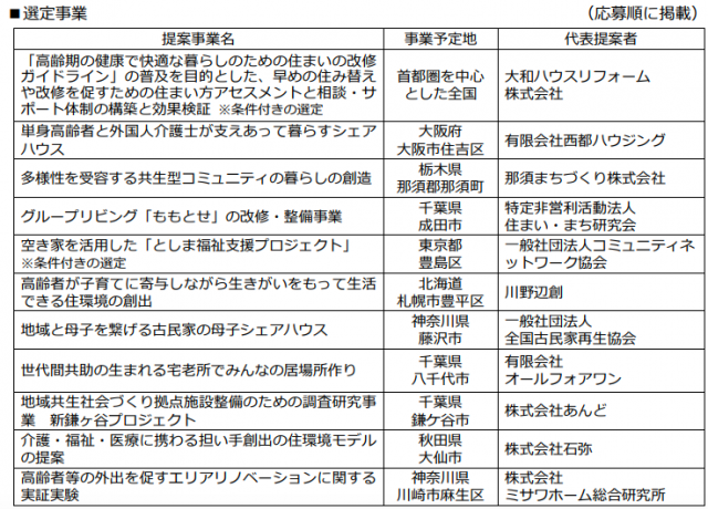 採択事業には、大和ハウスリフォーム(大阪市)の「『高齢期の健康で快適な暮らしのための住まいの改修ガイドライン』の普及を目的とした、早めの住み替えや改修を促すための住まい方アセスメントと相談・サポート体制の構築と効果検証」、西都ハウジング(大阪市)の「単身高齢者と外国人介護士が支えあって暮らすシェアハウス」、ミサワホーム総合研究所(東京都杉並区)の「高齢者等の外出を促すエリアリノベーションに関する実証実験」などが選定された。