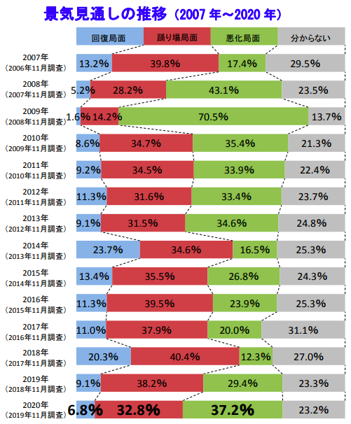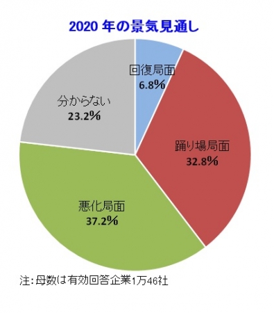2020年の景気見通しについて、「回復」局面を見込む企業は6.8%で2年連続の1ケタ台。「悪化」局面を見込む企業は37.2%となり、2年連続で増加し、過去3番目に高い水準となった。「踊り場」局面を見込む企業は32.8%と前回調査(38.2%)より減少し、景気の先行きについて1年前より厳しい見方を強めている様子がうかがえた。