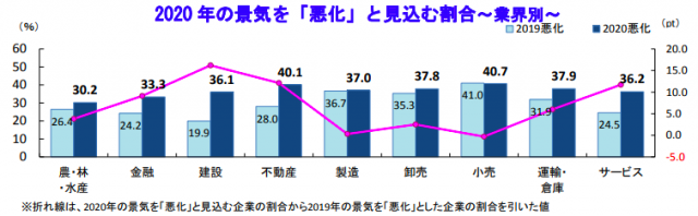 2020年の景気を「悪化」局面と見込む企業の割合を業界別で見ると、建設業は36.1%、不動産業は40.1%だった。