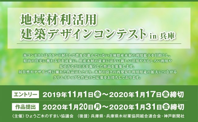 ひょうご木のすまい協議会(兵庫県宍粟市)は、兵庫県産木材の利用拡大を目的とした「地域材利活用 建築デザインコンテスト in 兵庫」を開催する。エントリーは2020年1月17日、作品提出は1月31日まで。