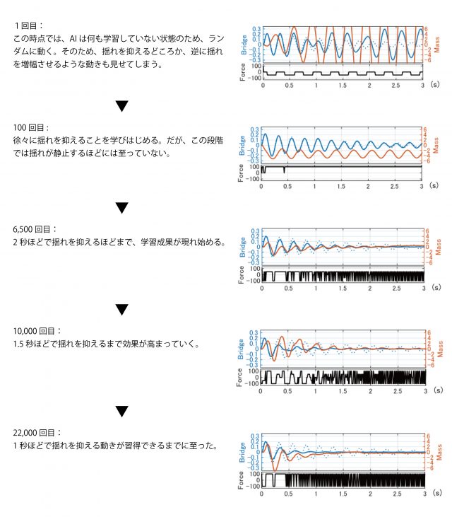 機械学習手法の1つである「強化学習」を用いたAIを採用。ゲームなどのシミュレーション環境で活用されてき強化学習を物理的な現場に応用したもので、AIが試行錯誤を経て、どのように行動すればいいかを自ら習得していく。今回の検証では、100回目くらいから徐々に揺れを抑えることを学び始め、6500回目には2秒ほどで揺れを抑えるまでになった。