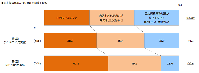 電通(東京都港区)のエネルギー関連のグループ横断組織、チーム「DEMS(ディームス)」は12月20日、全国の20~69歳の男女5600人を対象に実施した「第9回エネルギー自由化に関する生活者意識調査」の結果を発表した。それによると、自宅の太陽光発電を売電している人のうち、「固定価格買取制度(FIT)における買い取り期間が2019年から順次終了となる」ことを知っている人は86.4%で、前回より12.2ポイント増加した。