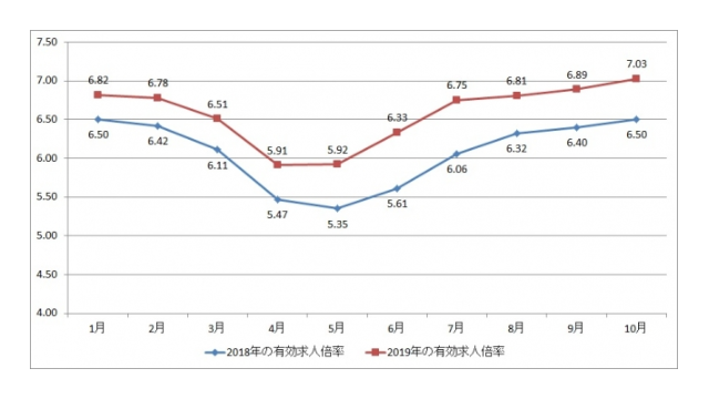 2019年1月~10月の建設技術者(建築・土木・測量技術者)の有効求人倍率はすべての月で前年同月を上回っており、建設技術者を採用することが前年以上に困難な状況が続いている。直近の10月の有効求人倍率は、前年同月比0.53ポイント増の7.03倍だった。有効求人倍率の先行指標となる新規求人倍率は、10月において前年同月より0.86ポイント高い9.95倍となった。