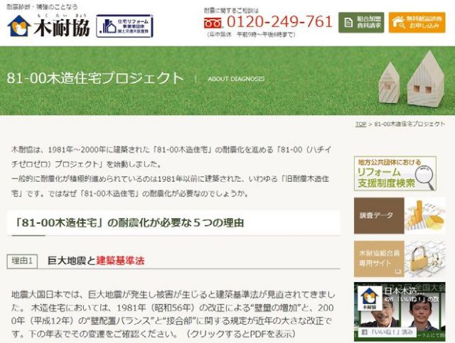 日本木造住宅耐震補強事業者協同組合(木耐協、東京都千代田区)は、耐震性の確認が必要とされている「81-00木造住宅」の耐震化を推進すべく、12月11日に「81-00プロジェクト」を始動。プロジェクト第2弾として「81-00木造住宅」の耐震化に関するホームページを開設した。
