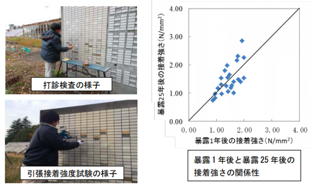 同試験は、同研究所の屋外暴露試験場で、縦2.5m×横2mのコンクリート壁に有機系接着剤を用いてタイルを張り付けて実施しているもの。暴露25年後の「接着強さ」 打診検査、引張接着強度試験を実施した結果、タイルのはく離などの不具合は見られず、暴露1年後と暴露25年後の接着強さの関係性からも25年後の「接着強さ」の著しい低下は見られなかった。