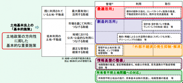 同省は今後、中間とりまとめ等を踏まえて更に検討を深める。2020年までに土地基本法等の見直しとともに、新たな土地基本法に基づく土地政策の再構築を図るための「新たな総合的土地政策」の策定に向けて取り組む。