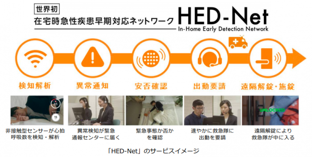 仕組みとしては、住宅内で住まい手のバイタルデータを「非接触型センサー」で検知・解析し、急性疾患発症の可能性がある異常を検知した場合に緊急通報センターに通知。オペレーターは、呼びかけによる安否確認、救急への出動要請、救急隊の到着確認、玄関ドアの遠隔解錠・施錠までを一貫して行う。こうした仕組みは世界初といい、「安否確認システム」として国内のシステム特許を取得したほか、国際特許を出願中。