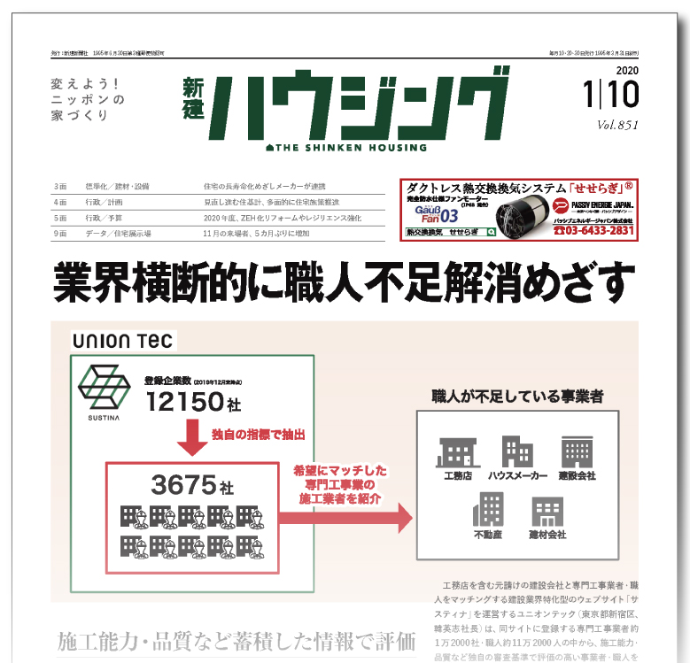 工務店を含む元請けの建設会社と専門工事業者・職人をマッチングする建設業界特化型のウェブサイト「サスティナ」を運営するユニオンテック(東京都新宿区、韓英志社長)は、同サイトに登録する専門工事業者約1万2000社・職人約11万2000人の中から、施工能力・ 品質など独自の審査基準で評価の高い事業者・職人を元請けの要望に応じて紹介する新たなサービスを、早ければ2月にもスタートする方針を固めた。