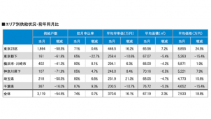 エリア別の変動率は東京都区部が▲0.0%(前回0.1%)、東京都下0.5%(前回0.4%)、神奈川▲0.4%(前回0.0%)、埼玉0.0%(前回0.0%)、千葉0.5%(前回0.0%)。