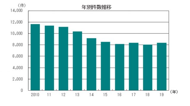 帝国データバンク(東京都港区)は1月14日、「全国企業倒産集計2019年報」を発表した。2019年の全国企業の倒産件数は前年比3.6%増の8534件で2年ぶりに増加した。建設業は前年と同じ1414件、不動産業は2.8%増の255件となった。