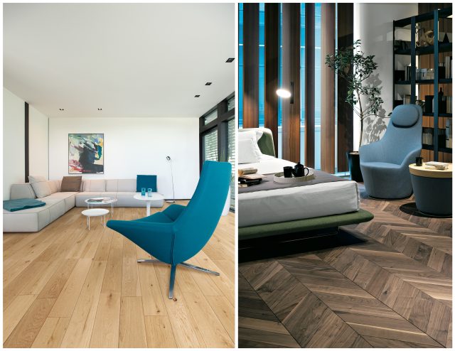 今回の新デザインは、節や色のばらつきをあえて取り入れて手づくり感を表現した「ビンテージフロアーラスティック」と、通常の5分の1の施工時間でヘリンボーン柄が可能になる「ビンテージフロアーラスティックフレンチヘリンボーン」の2種類。