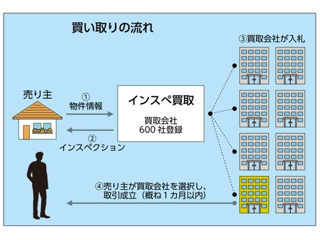 「インスぺ買取」は第2フェーズにあたり、事業者と連携した買い取りの仕組みにより、中古不動産流通を推し進める。売り主と買い主を直接結び付けるため、売り主にとっては、仲介よりも短期間、高値での売却ができ、買い主にとっては、仲介事業者の手数料がかからないため仕入れコストを抑えられるといった利点がある。