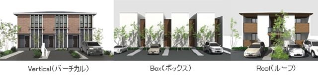 商品名の「カレ」はフランス語で「四角」「広場」を表しており、外観デザインにスクエアをベースにした「Vertical(バーチカル)」「Box(ボックス)」「Roof(ルーフ)」の3種類を用意。都市の街並みに調和するスタイリッシュな外観で、デザイナーズ賃貸住宅のラインアップを強化した。